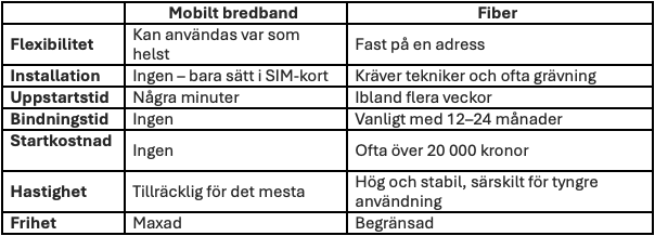 Men fiber har också sina nackdelar. Det kräver ofta grävning, väntetid och installation, och nästan alltid får du stå ut med bindningstid eller startkostnad. Och om du en dag behöver flytta, så flyttar inte uppkopplingen med dig.